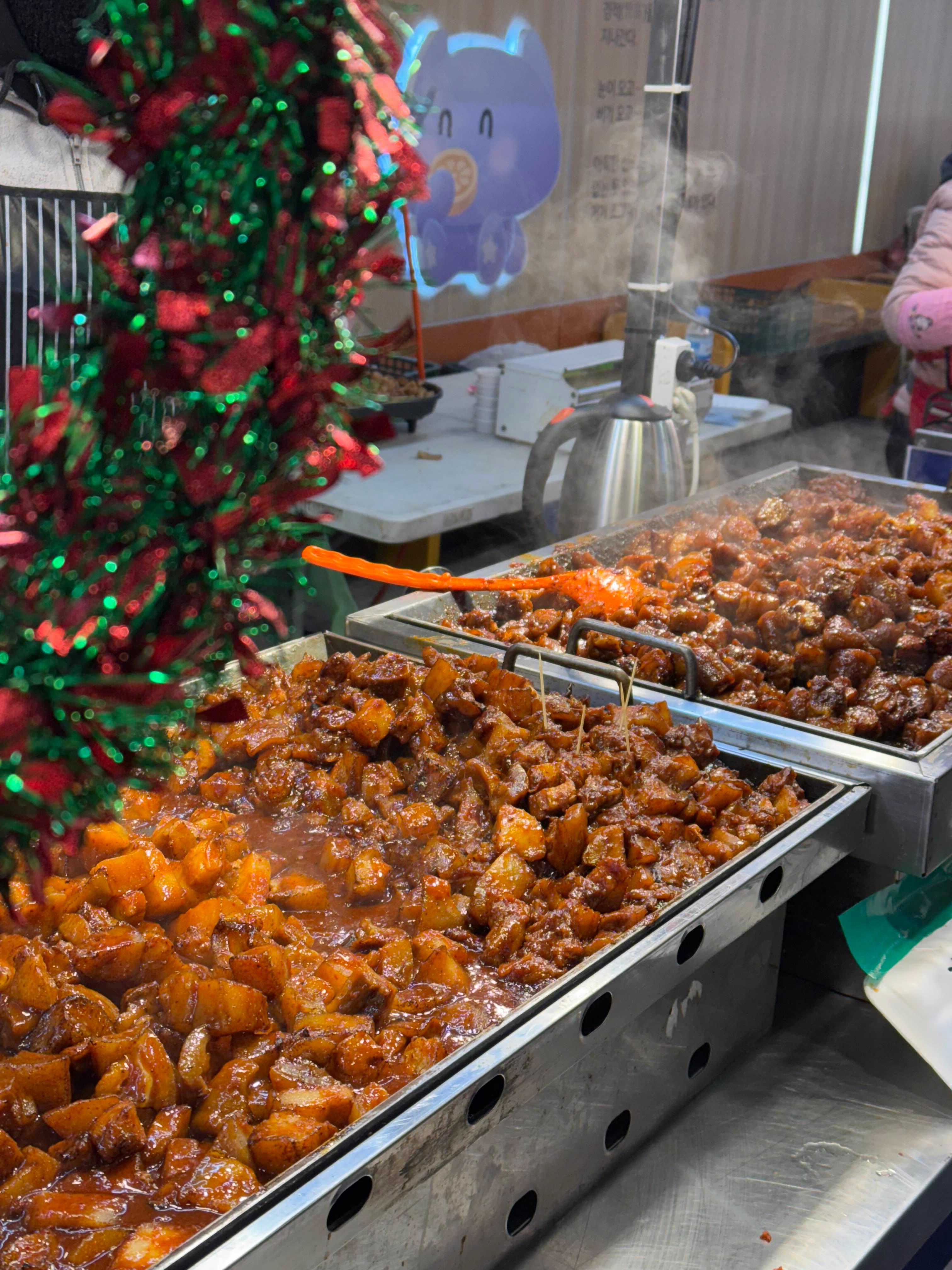 중앙시장에서는 겨울에도 야시장이 열려 있었는데요, 솔이네 계란빵을 비롯해 다양한 길거리 음식과 포장마차 분위기를 즐길 수 있었습니다.