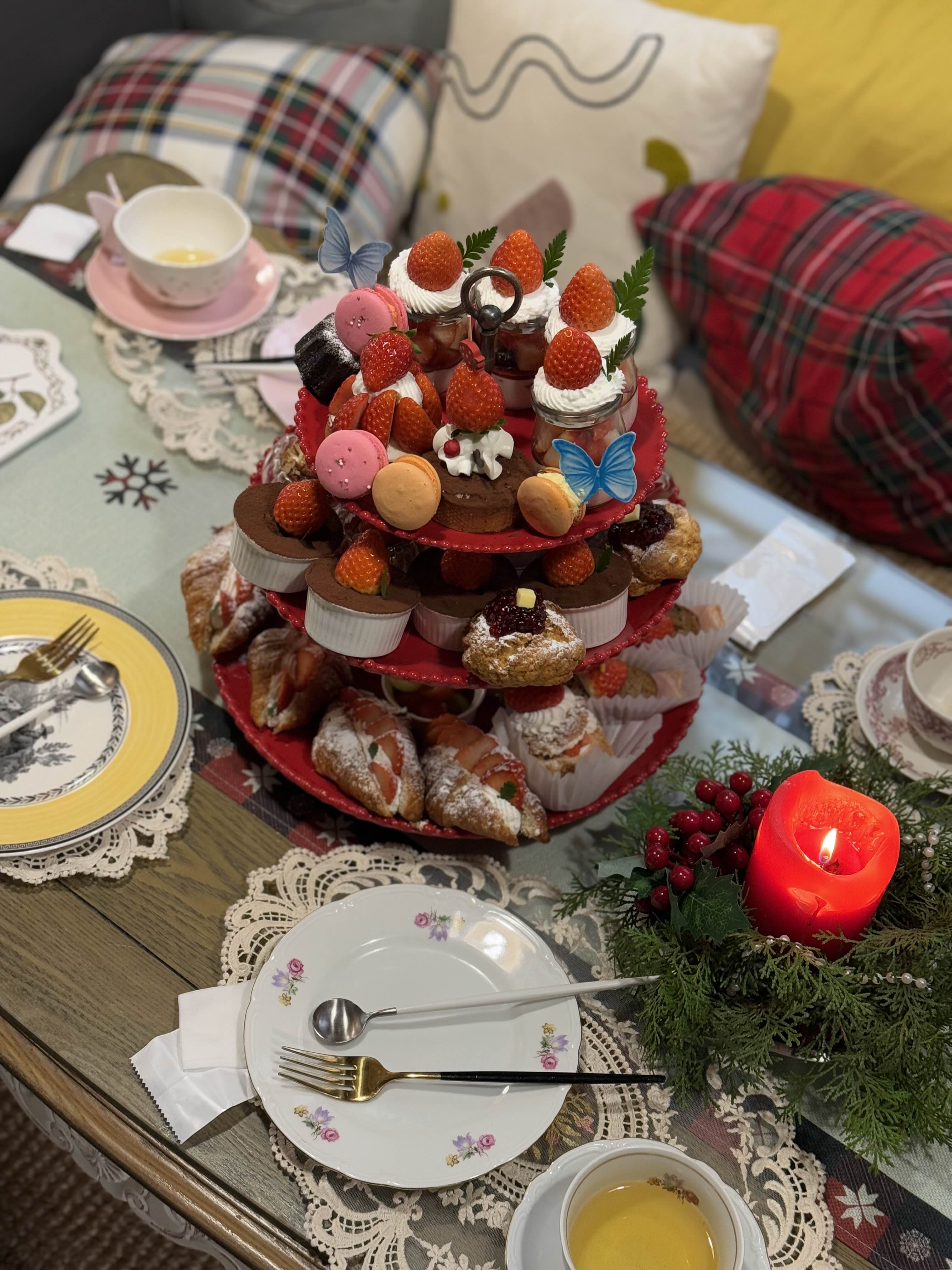 저희는 딸기 시즌에 맞춰 ‘딸기 애프터눈티 세트’를 예약해서 다녀왔고, 다채로운 디저트와 차가 층층이 트레이에 담겨 제공되어 감탄했어요.