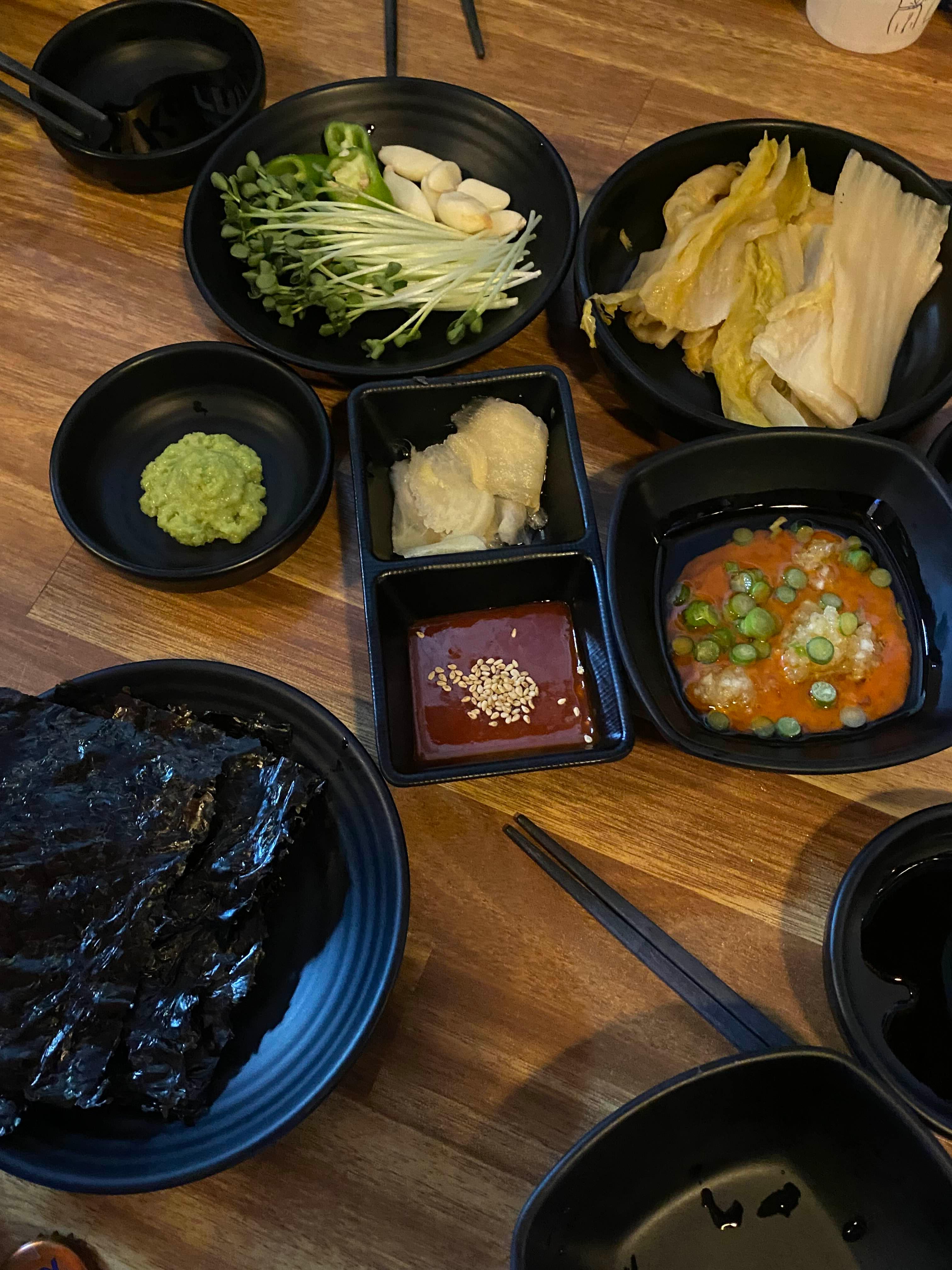 묵은지, 김, 무순, 마늘, 쌈장, 초장, 와사비까지 회와 함께 다양하게 곁들일 수 있게 준비되어 있어요.