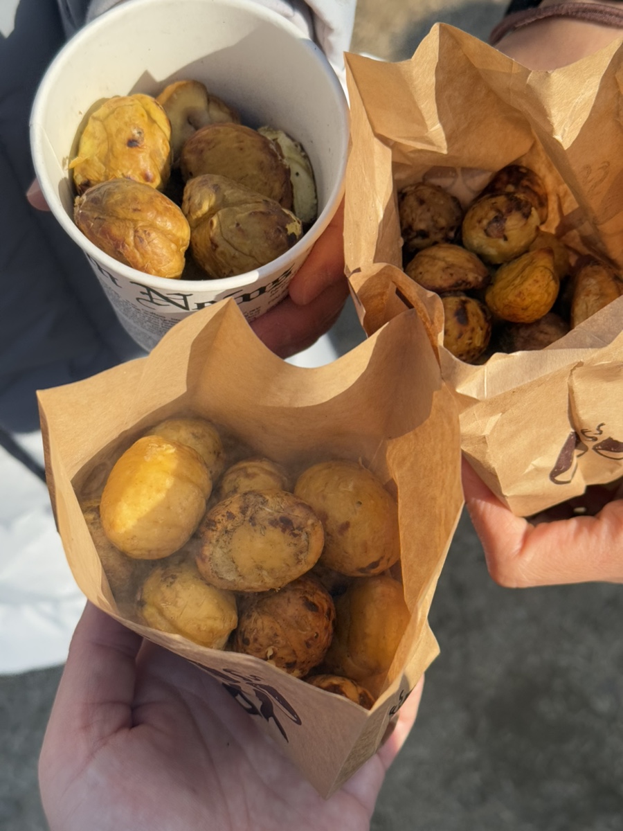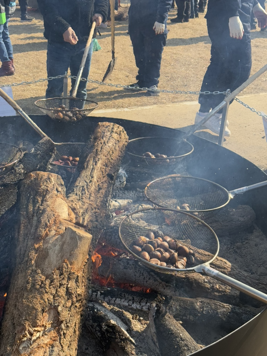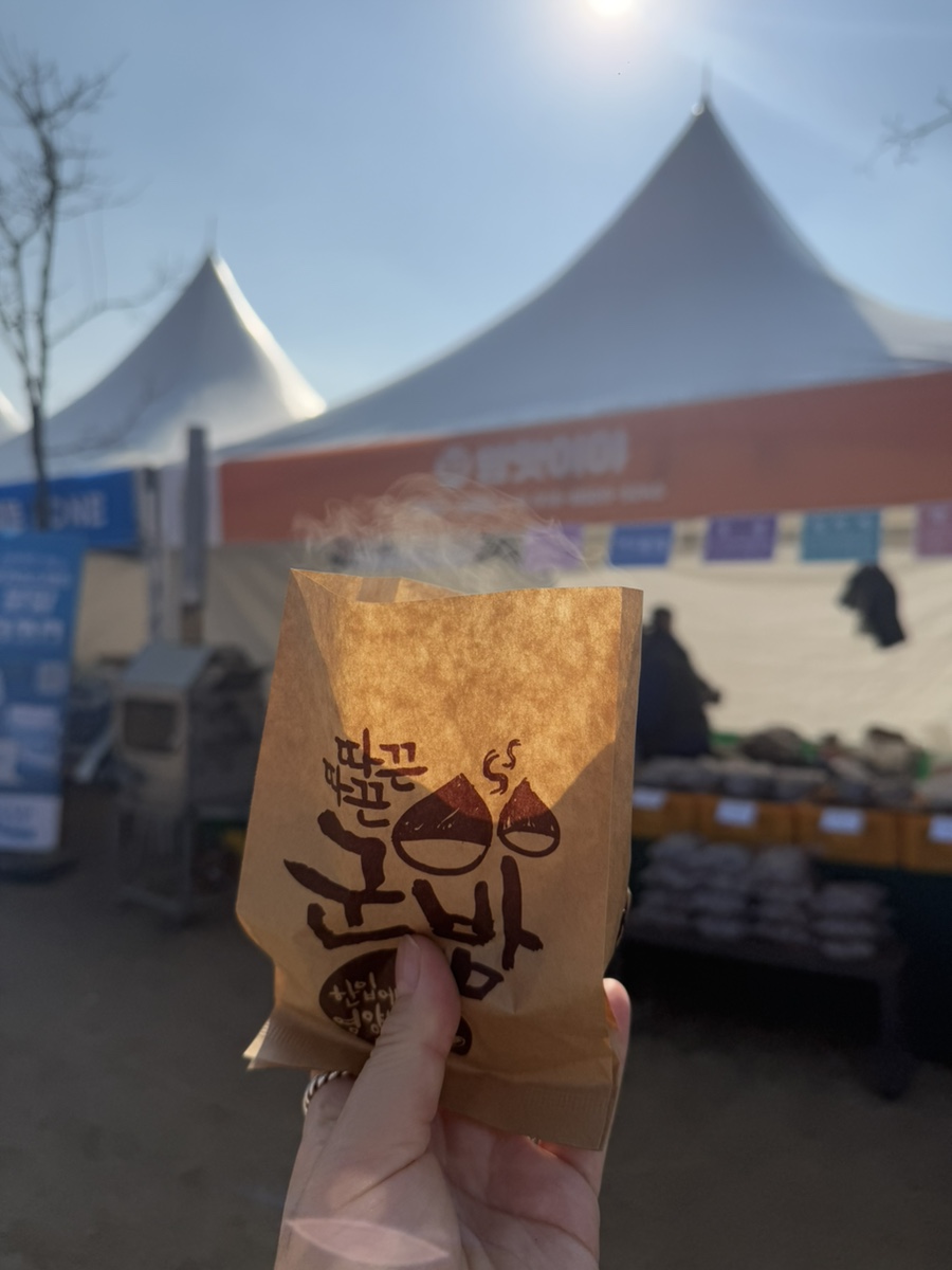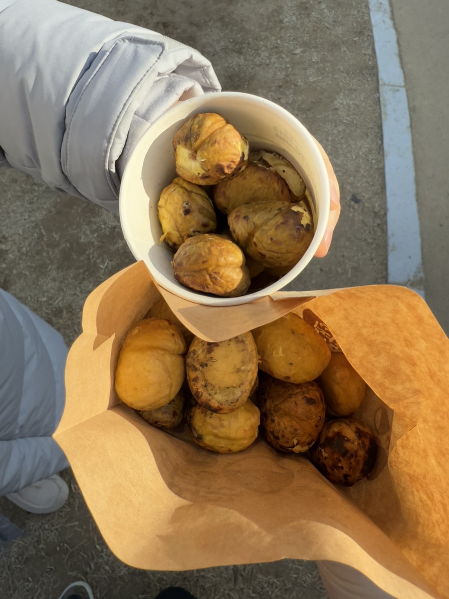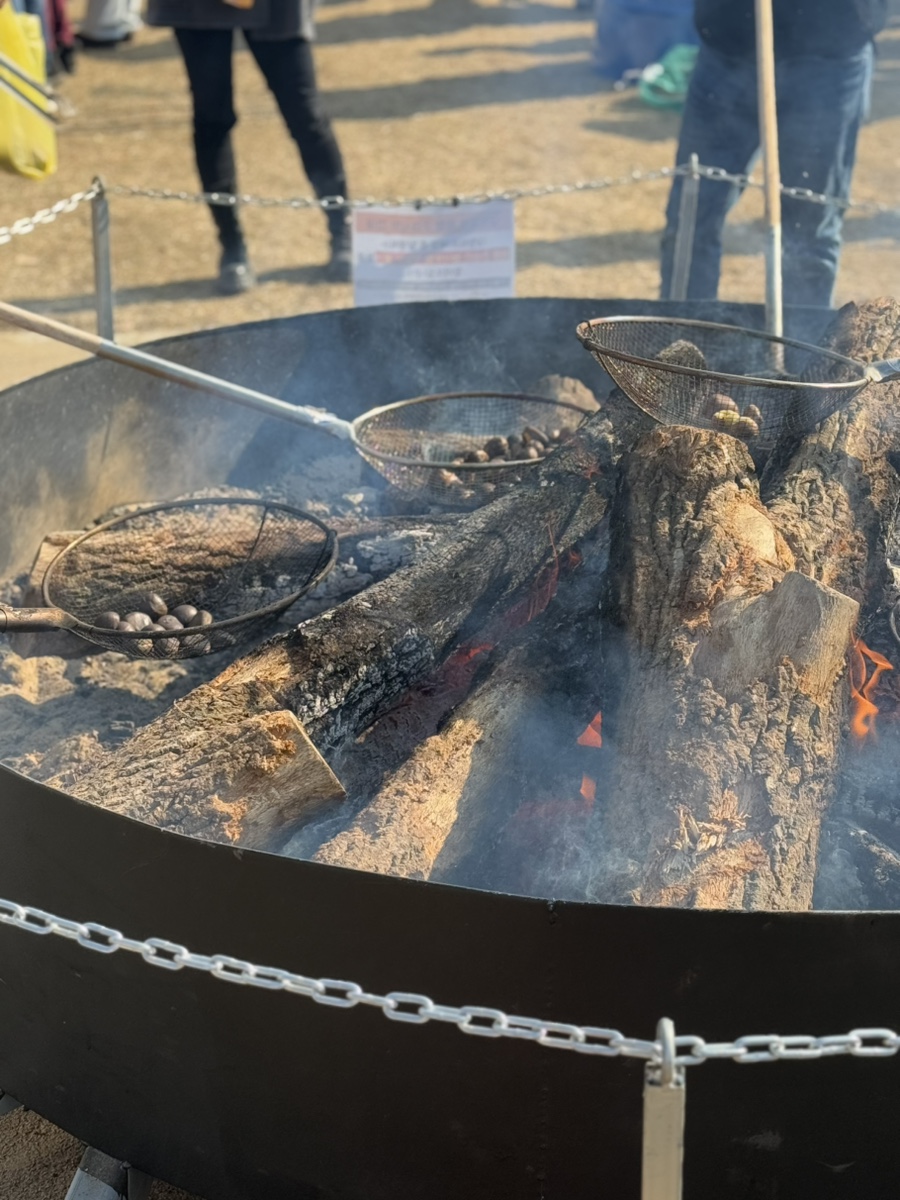 군밤은 여러 부스에서 판매하고 있어 각자 마음에 드는 곳에서 사서 다시 모였는데요, 같은 밤이라도 굽는 방식에 따라 맛과 촉촉함이 조금씩 다르더라고요. 이런 소소한 차이를 비교해 보는 것도 축제의 재미였습니다.
